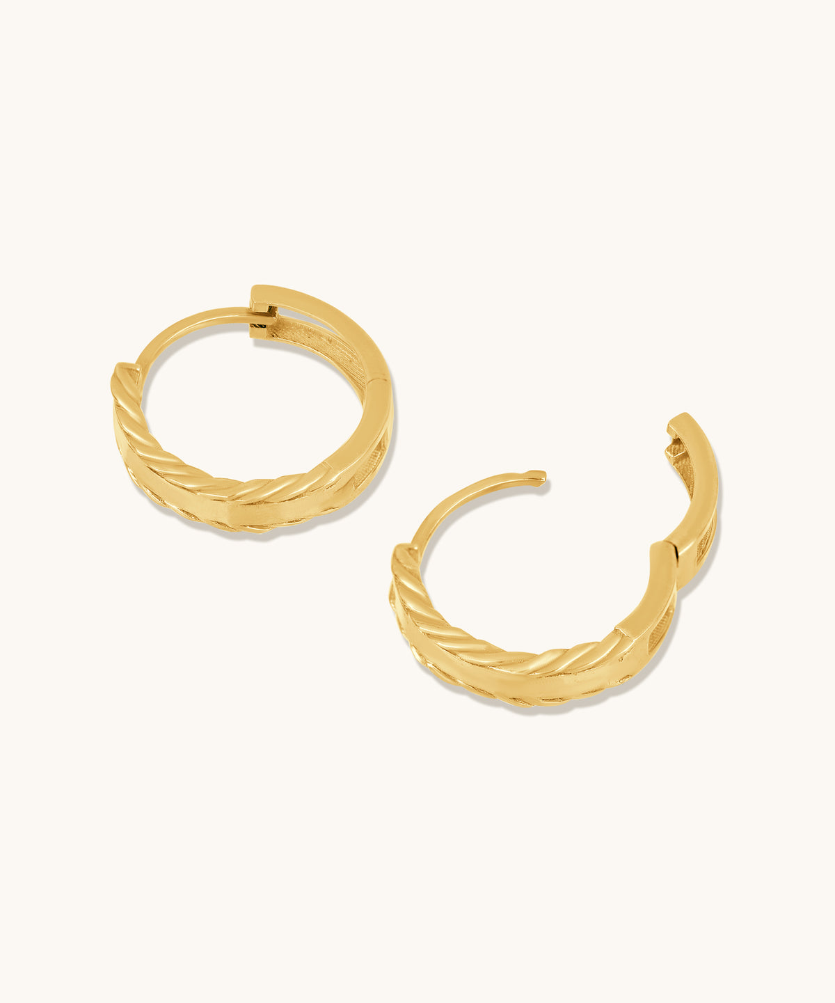 Intricately shaped in 14k gold, these 12mm huggies feature a rope-like twisted edge framing a smooth, polished center. The textural contrast creates refined interest while keeping a timeless, minimal profile.