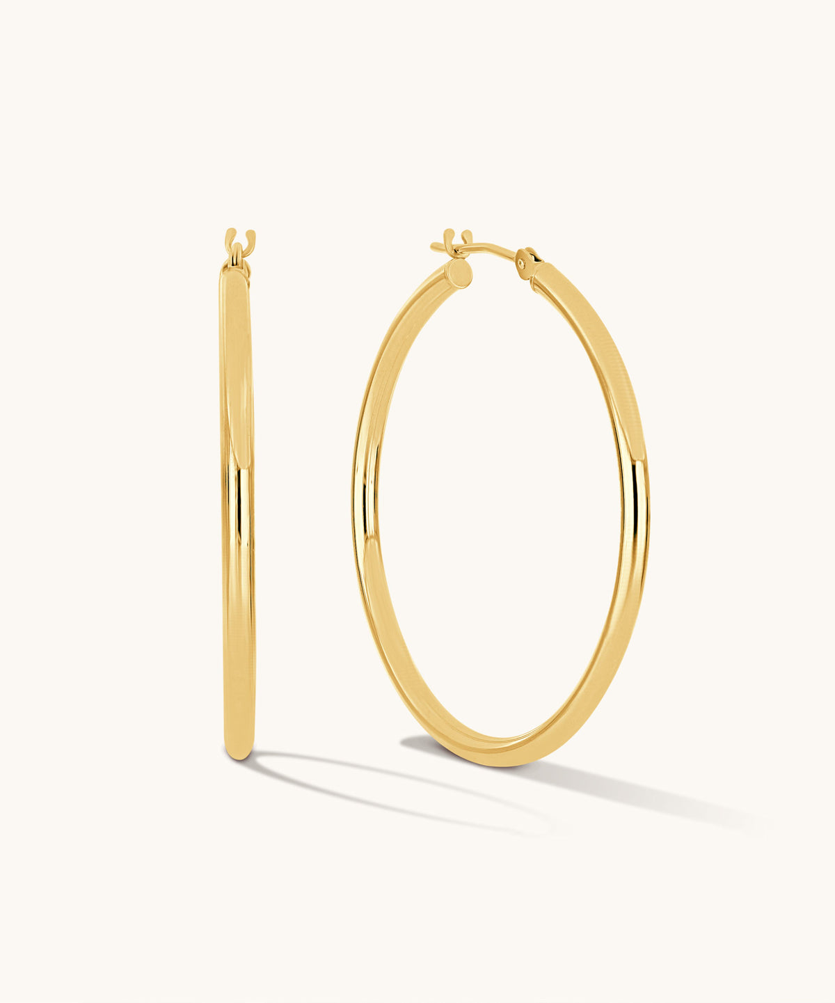 Slip into effortless elegance with these 35mm tube hoops in 14k solid gold. Measuring 2mm wide with a 35mm outer diameter, they highlight balanced silhouette. Lightweight and comfortable, they bring day-to-night ease and are finished with a latch back closure and hypoallergenic design.