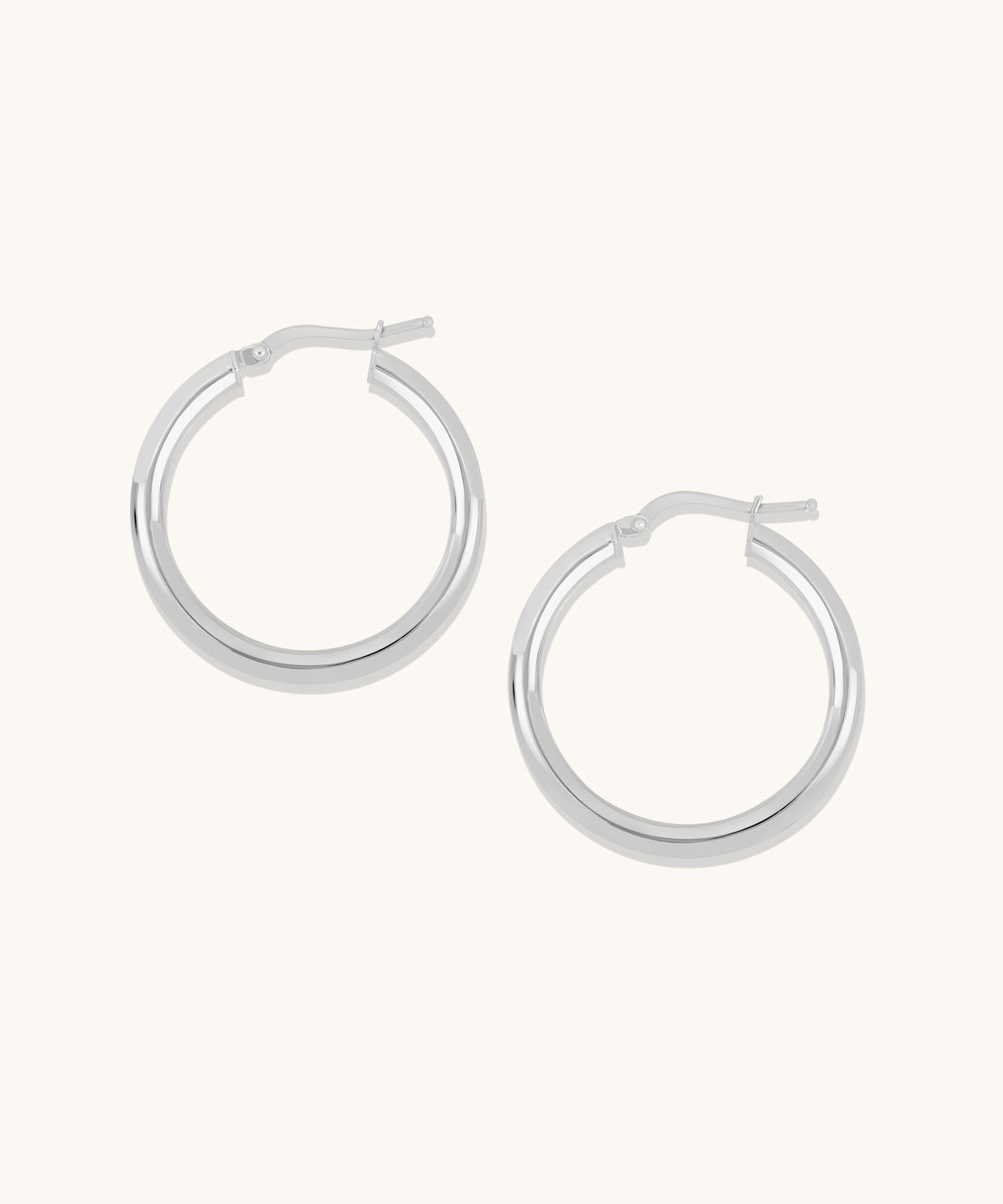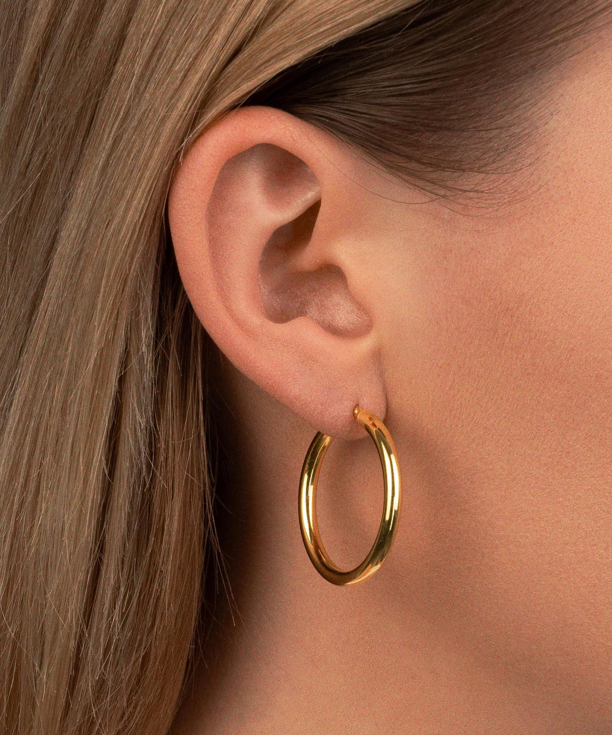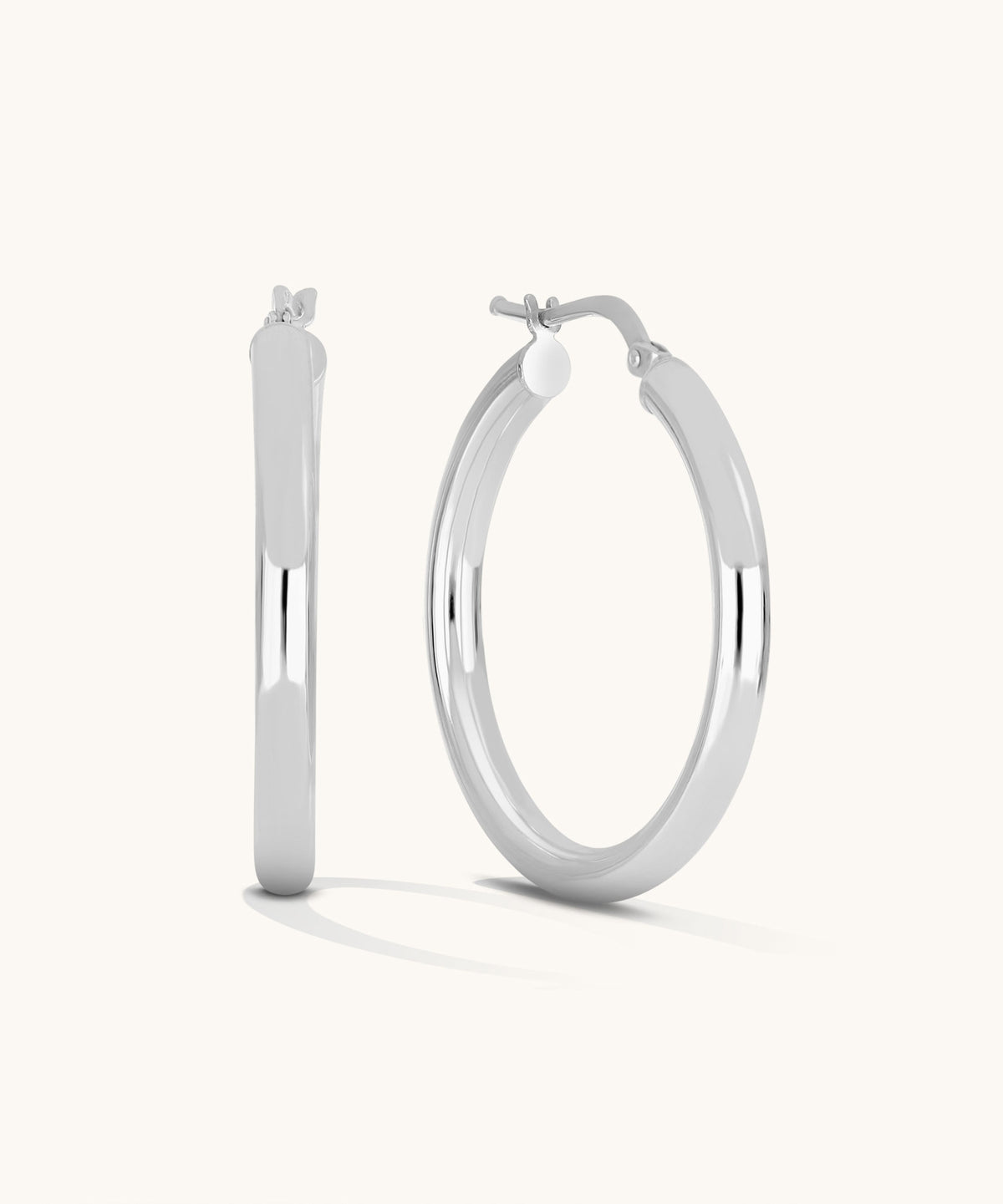 Slip into effortless elegance with these 30mm tube hoops. Measuring 3mm wide with a 30mm outer diameter, they highlight sleek profile. Lightweight and comfortable, they bring stacking ease and are finished with a latch back closure and hypoallergenic design.