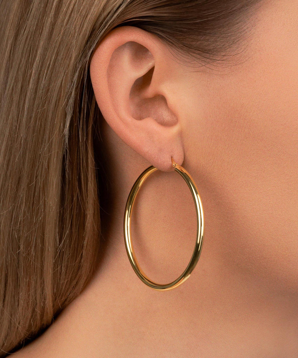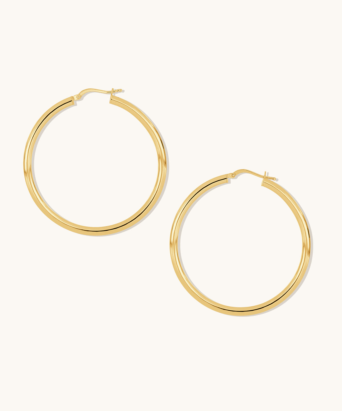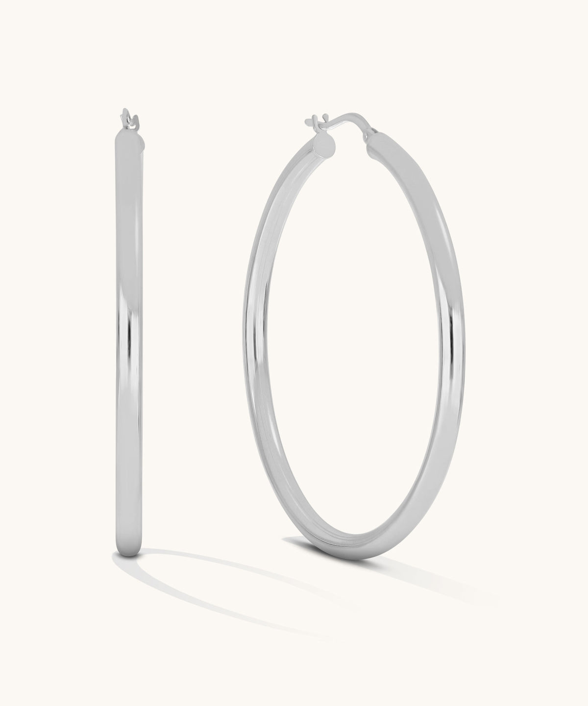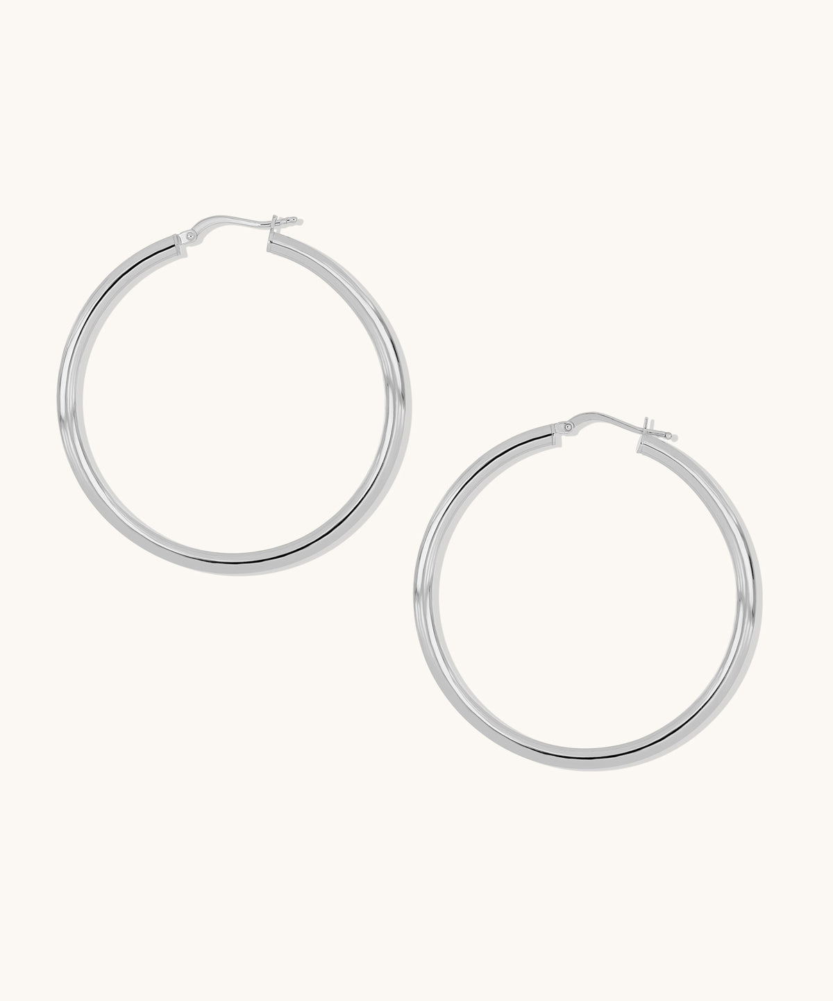 Elevate your essentials with these 50mm tube hoops. Measuring 3mm wide with a 50mm outer diameter, they highlight delicate edge. Lightweight and comfortable, they bring day-to-night ease and are finished with a latch back closure and hypoallergenic design.