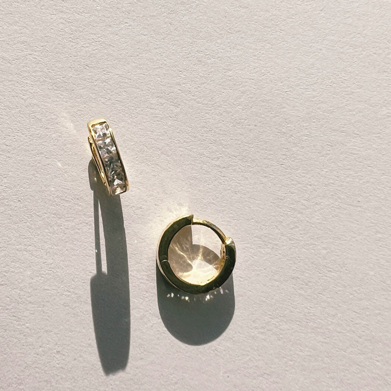 Layer huggies across multiple piercings. Mix metals, play with textures, and add a bold hoop or dainty stud for balance.
