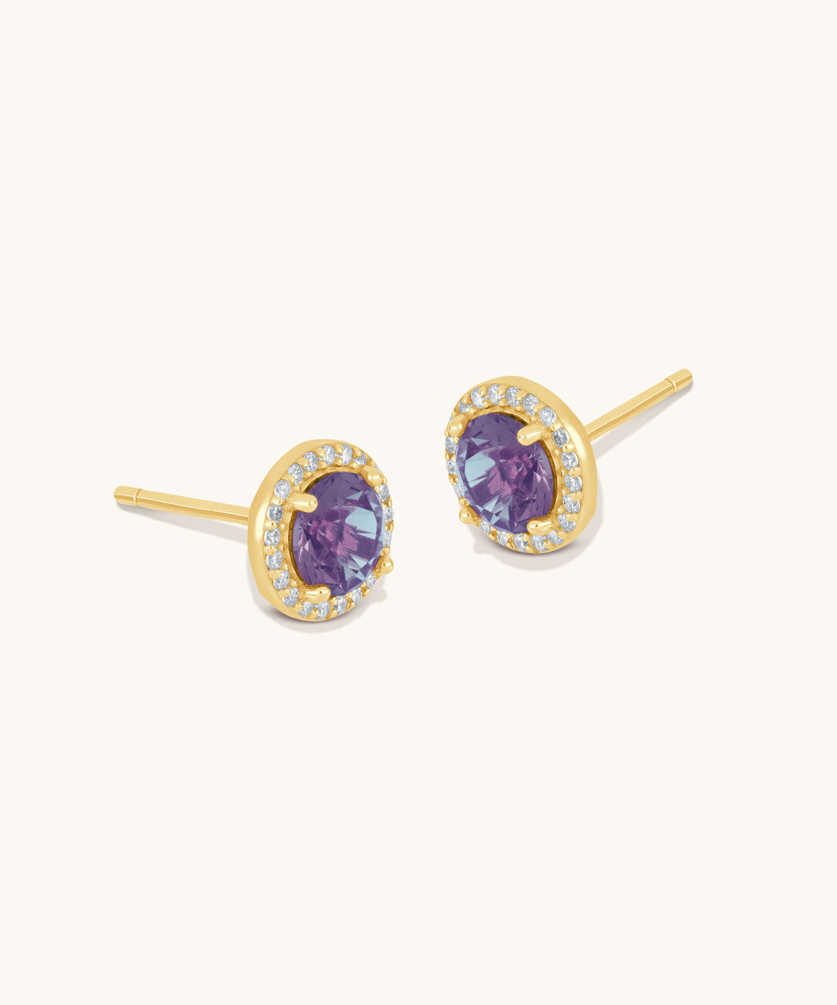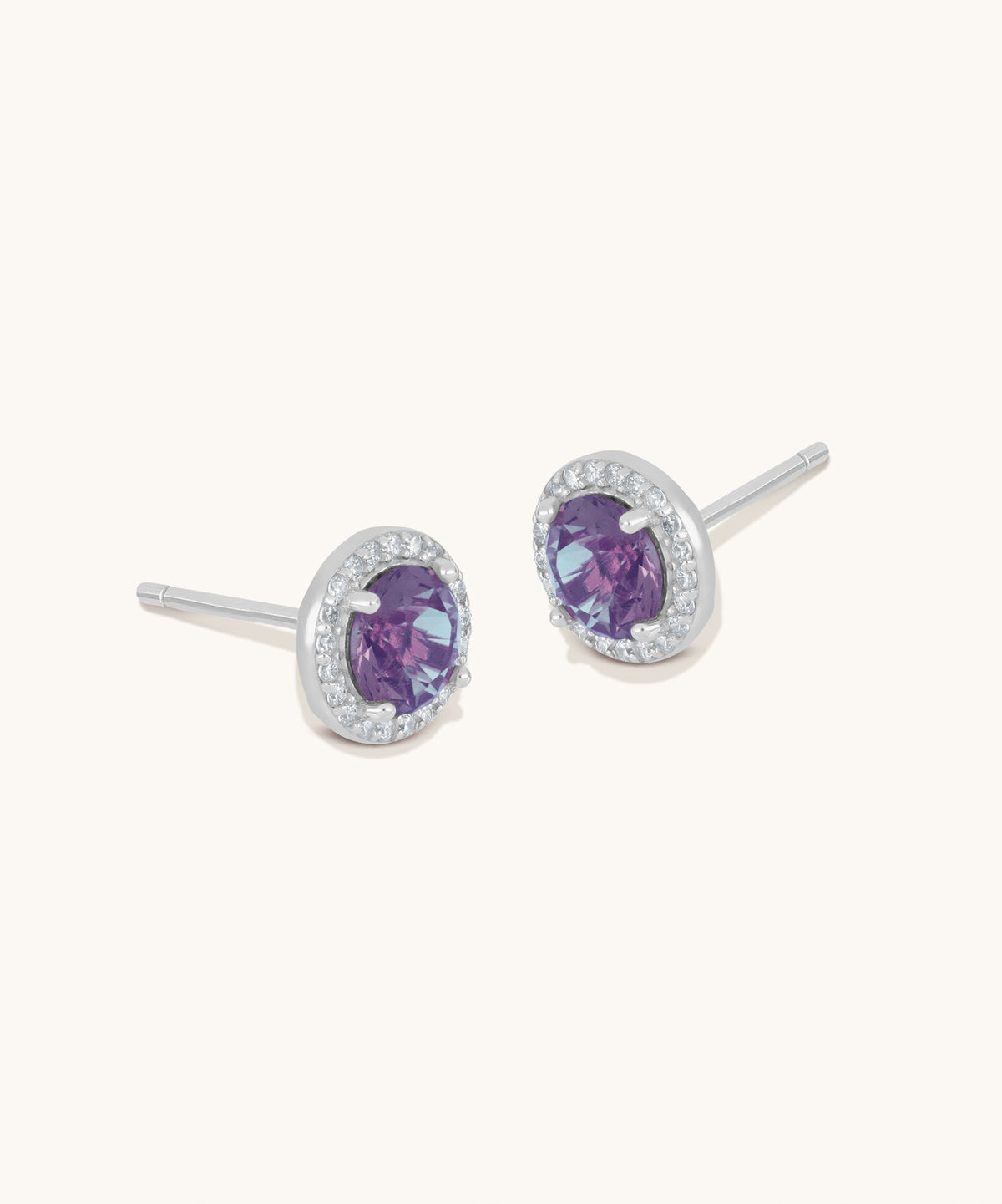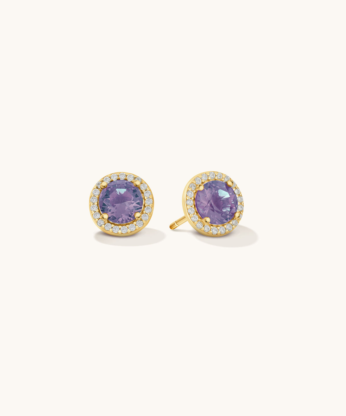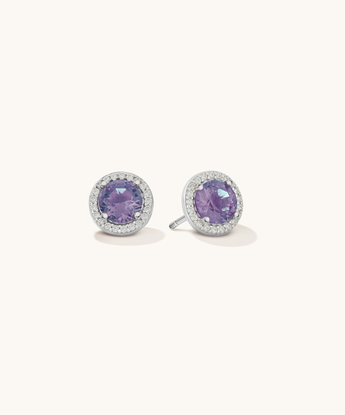 A vivid purple stone sits at the center of these round halo studs, encircled by a shimmer of cubic zirconia for a balanced mix of color and sparkle.
